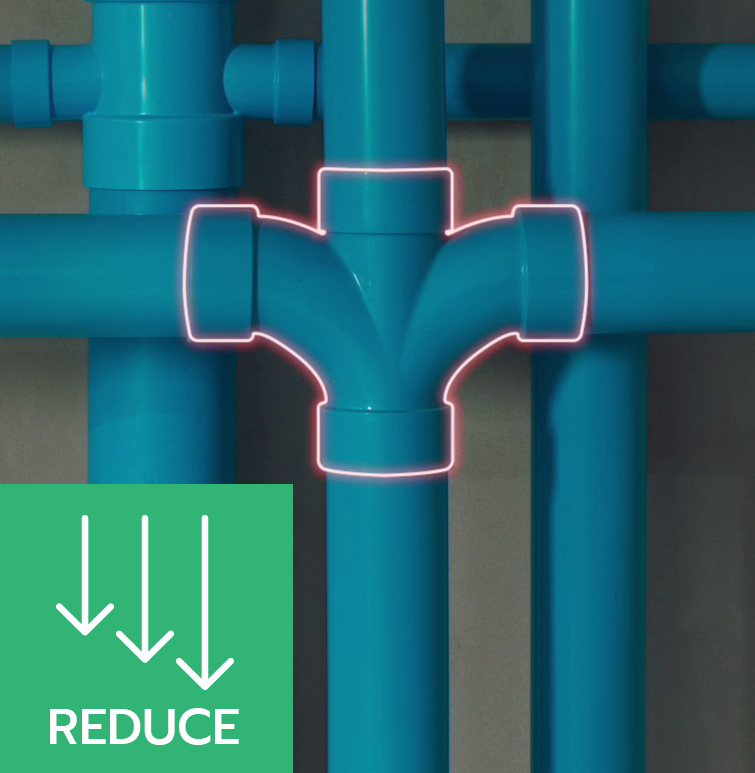 การลดการใช้ - การต่อท่อแบบใหม่ ใช้วัสดุน้อยลง เช่น การคำนวณปริมาณท่อตั้งแต่ขั้นตอนการเขียนแบบ Shop Drawing , การใช้ท่อ Made to Order เพื่อให้พอดีกับการใช้ , การคิดค้นการต่อท่อแบบใหม่โดยใช้ท่อ 4 ทาง , การใช้ท่อระบบดับเพลิงแบบไร้ข้อต่อ ซึ่งสามารถลดการใช้วัสดุที่ไม่จำเป็นและลดปริมาณขยะเศษท่อไปได้เทียบเท่าความยาวหลายร้อยกิโลเมตร นอกจากนี้ยังออกแบบพื้นที่ให้พอดีกับขนาดกระเบื้อง เพื่อให้เหลือเศษกระเบื้องน้อยที่สุด